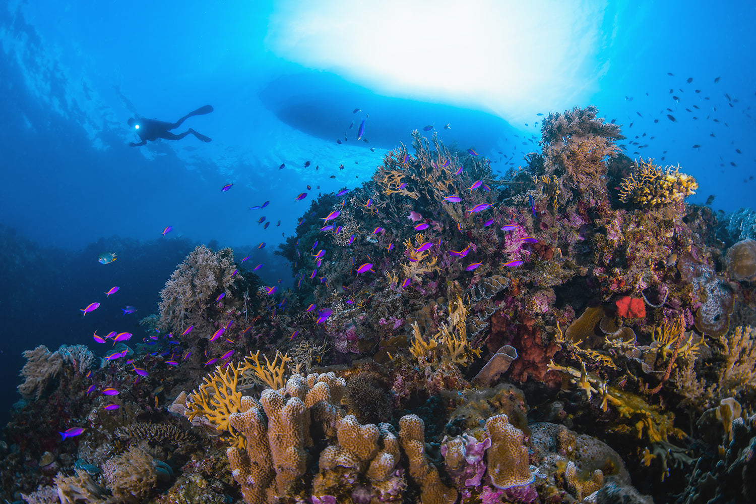 Beneath a cathedral-like beam of sunlight, a diver drifts above a thriving coral reef teeming with life. This vivid underwater scene captures the dynamic biodiversity of the tropics, where brilliant purple anthers dace above fields of branching coral and sponges.