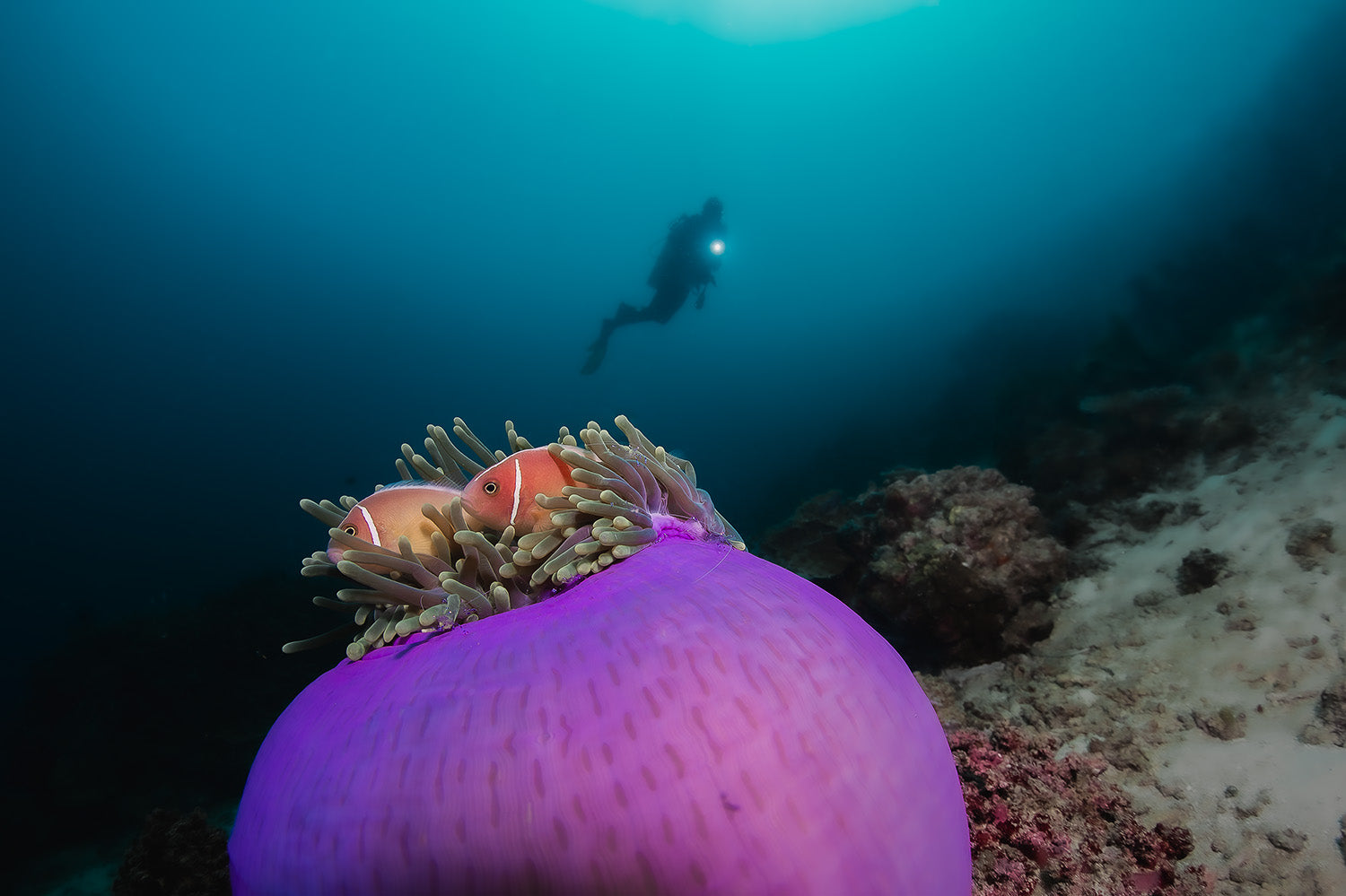 Dive into the mesmerizing depths of the ocean with our “Underwater Harmony”. This breathtaking underwater shot captures two vibrant pink skunk clownfish nestled in the protective embrace of a purple sea anemone, while a scuba diver floats gracefully in the blue abyss. The vibrant colors, striking clarity, and serene composition make it a perfect centerpiece for ocean lovers and marine life enthusiasts.