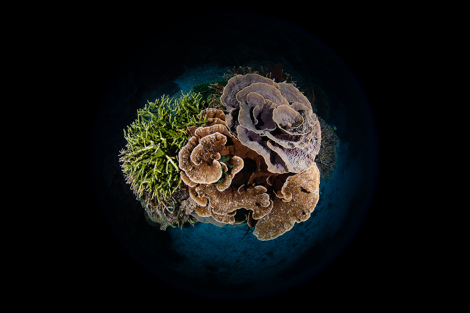 A mesmerising top-down view capturing the intricate patterns and vibrant textures of natural forms of hard coral colony. This piece evokes a sense of wonder - as if gazing at a miniature planet, floating in the dark expanse of space. Perfect for modern interiors and nature lovers.